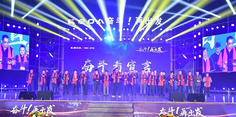 1992年,一群奮斗者創(chuàng)辦科達,歷經(jīng)26年的風雨洗禮,在“求真務(wù)實、踏實苦干”、“財散人聚、財聚人散”的精神號召下,凝聚了一大批志同道合的有志之士,助推企業(yè)一步一個腳印發(fā)展至今,26年后的今天,科達憑借著一代代奮斗者們銳意創(chuàng)新、拼搏進取的精神,從一個名不見經(jīng)傳的五金小作坊成長為建材機械行業(yè)龍頭企業(yè),從中國走向世界!為了更好地支持“全球化”戰(zhàn)略大布局,再攀高峰,公司需要更多科達人投身到奮斗的洪流中,加入奮斗者行列,傳承科達的奮斗精神,以奮斗點燃事業(yè),揚帆再出發(fā)!為隆重其事,在兩臺晚會現(xiàn)場特別設(shè)置了“奮斗者宣言”誓師儀式,公司所有高管及各事業(yè)部、子公司、支持服務(wù)平臺等中高層骨干代表團隊及全體員工方陣分別進行“奮斗者宣言”誓師。