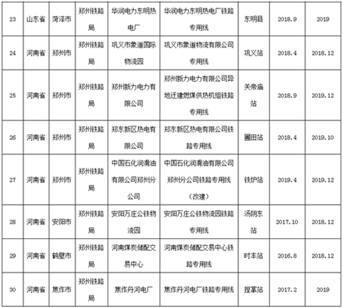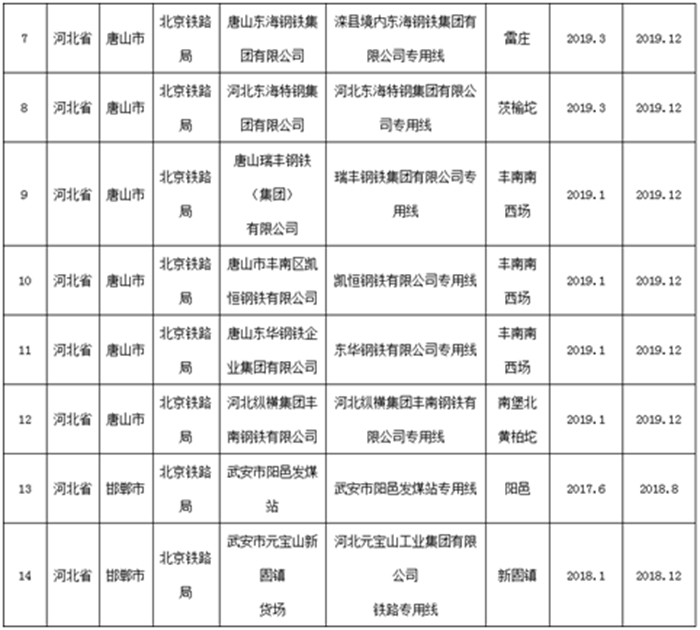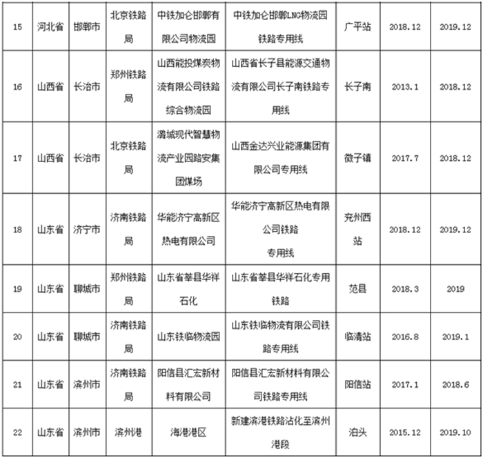 12.加快推進鐵路專用線建設。各地要逐一核實《交通運輸部等九部門貫徹落實國務院辦公廳〈推進運輸結構調整三年行動計劃(2018-2020)〉的通知》中鐵路專用線重點建設項目(見附件2)落實情況,按照《關于加快推進鐵路專用線建設的指導意見》要求,積極推進鐵路專用線建設;2019年10月底前,各地要對大宗貨物年貨運量150萬噸及以上的大型工礦企業和新建物流園區鐵路專用線建設情況、企業環評批復要求建設鐵路專用線落實情況等進行摸排。對工程進度滯后的,要分析查找原因,分類提出整改方案,確保2020年基本完成。若涉及規劃調整、項目變更、企業搬遷退出等因素不再建設的,地方可提出變更申請,由主管部門確認。